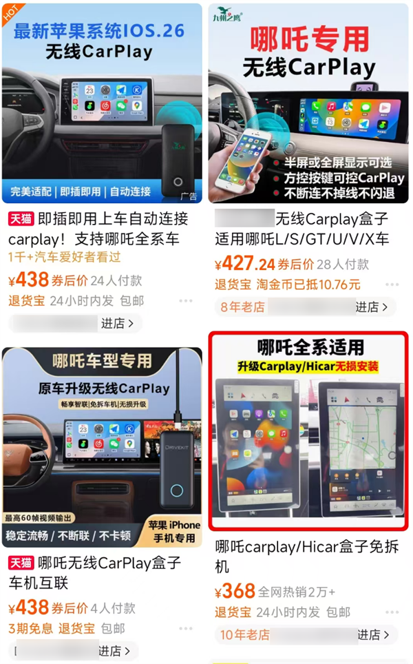 第二,对于喜欢折腾的“极客”们,可以买那种CarPlay 盒子自己捣鼓一下,现在已经有不少商家闻风而动了,就逮着哪吒车主薅。