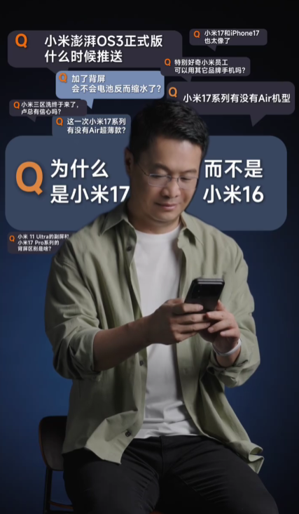 预热视频显示,卢伟冰将回应“为什么是小米17,而不是小米16?” “小米17系列有没有Air机型”“加了背屏会不会电池反而缩水了”“小米澎湃OS 3正式版什么时候推送”等话题。