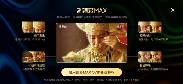 纯净度方面,“AI修复”能够识别并抹除老片画面中常见的雪花噪点与杂质,细致程度达到“逐帧级别”。