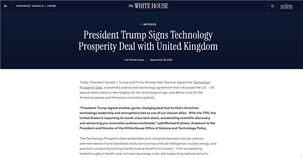 随后,特朗普和斯塔默签署了一项《科技繁荣协议》,共同努力开发用于医疗保健的人工智能模型,扩大量子计算能力,简化民用核项目。