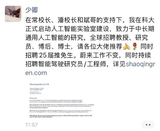 另外,他还解释称,“在常校长、潘校长和斌哥的支持下,我在科大正式启动人工智能实验室建设,致力于中长期通用人工智能的研究,全球招聘教授、研究员、博后、博士,请各位大佬推荐同时招聘25届推免生。蔚来工作不变,同时持续招聘智能驾驶研究员/工程师。”