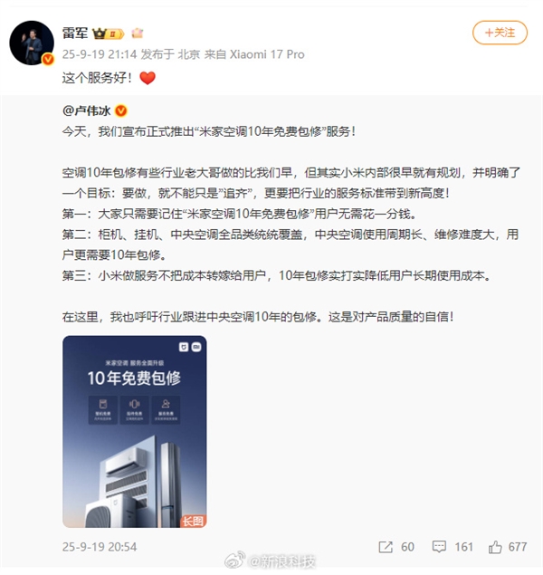 “十年保修这个事情我们的确早就有规划了。从今天开始小米空调正式推出十年保修服务。”