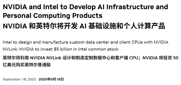 就在昨天英伟达和英特尔发布声明,英伟达将投资50亿美元,收购英特尔的部分股份。