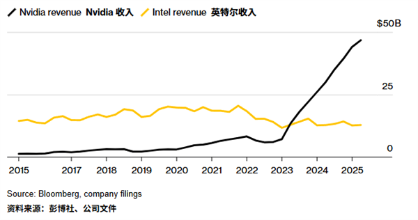 要知道,这俩在过去几十年里一直在龙争虎斗,甚至在2023年之前,英特尔始终牢牢压着英伟达。