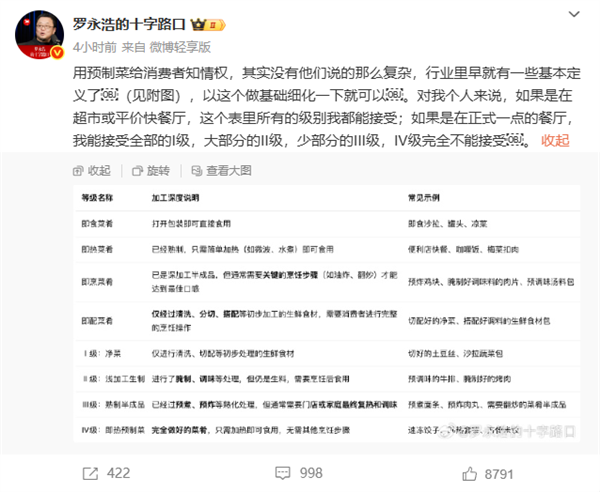 今晚,罗永浩针对“预制菜”再发文,表示预制菜给消费者知情权,其实没有他们说的那么复杂。