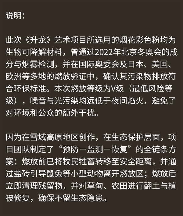 蔡国强工作室称,此次《升龙》艺术项目所选用的烟花彩色粉均为生物可降解材料,并在国际奥委会及日本、美国、欧洲等多地的燃放验证中,确认其污染物排放符合环保标准。