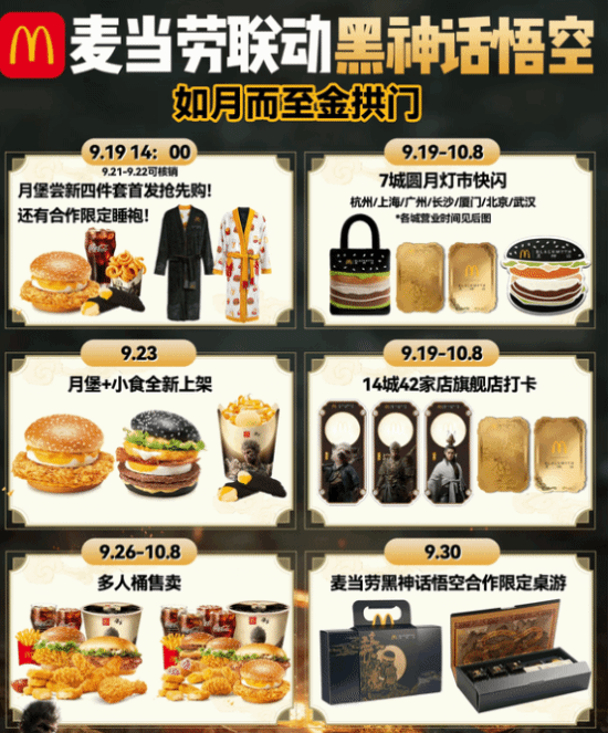 本次联动有咸蛋黄鸡腿蛋月堡、黑金奶黄年糕风味派、如意金箍扭扭薯以及桂花酒酿风味双旋圆筒等多项限定餐食,还有一件麦当劳黑神话合作限定居家服。