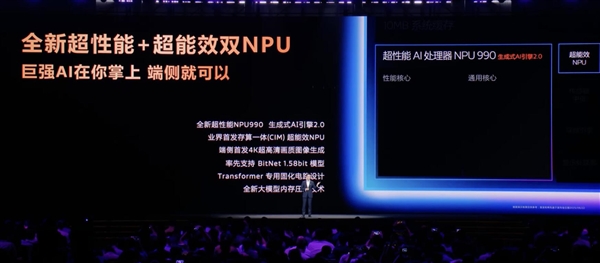 同时NPU 990还兼顾让AI体验更持久的卓越能效,相较上一代在峰值性能下的功耗降低56%。NPU 990还集成了生成式AI引擎2.0,率先支持BitNet 1.58bit大模型运算,通过减少端侧AI运算的存储需求来显著降低模型运行的功耗。
