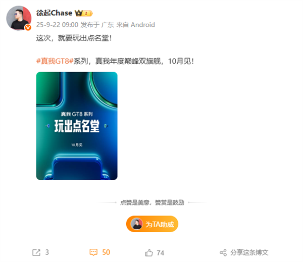 9月22日消息,今日,真我GT8系列官宣,新机将在10月发布,将带来GT8和GT8Pro两款年度旗舰,号称“将越级进行到底”。