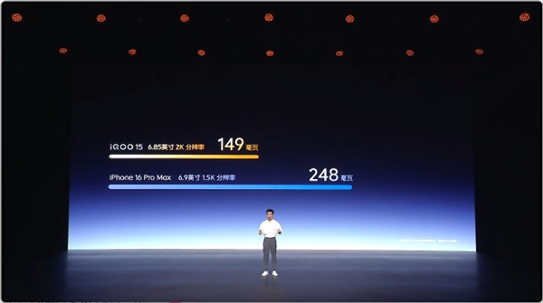 更重要的是,对比iPhone 16 Pro Max的6.9英寸1.5K分辨率屏幕,iQOO 15 6.85英寸2K分辨率屏幕功耗更低。