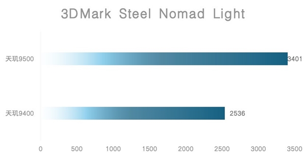 GPU方面,在能够体现当下主流手机游戏性能需求的3DMarkSteel Nomad Light测试中,天玑9500工程机的3DMark Steel Nomad Light得分为3401分,对比上代提升接近900分,相对同期友商旗舰新品也同样具有领先优势。