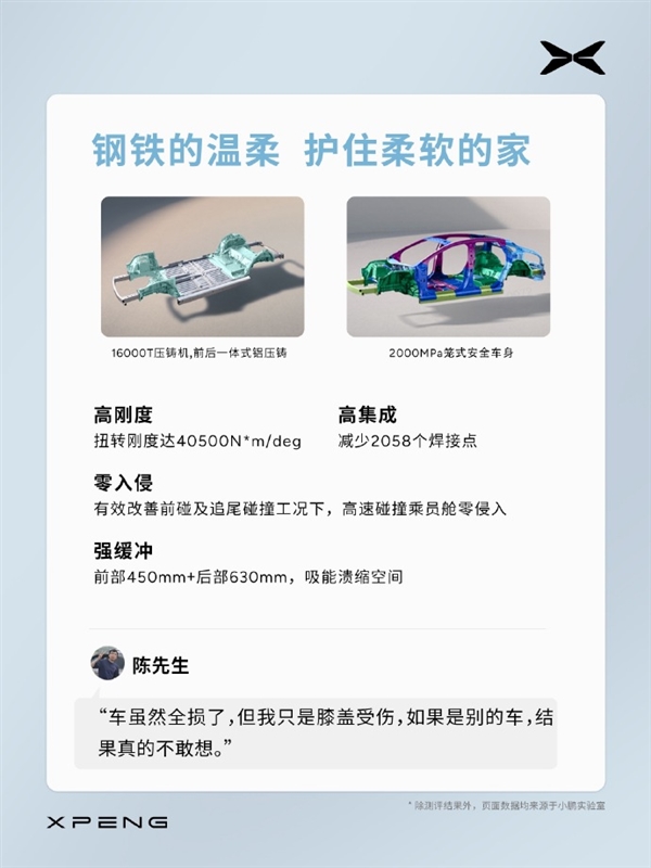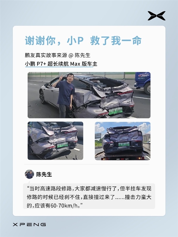近日,一位“小鹏P7+超长续航Max版”车主在高速路段遭遇半挂车追尾事故,车辆全损,但车主仅膝盖轻微受伤。