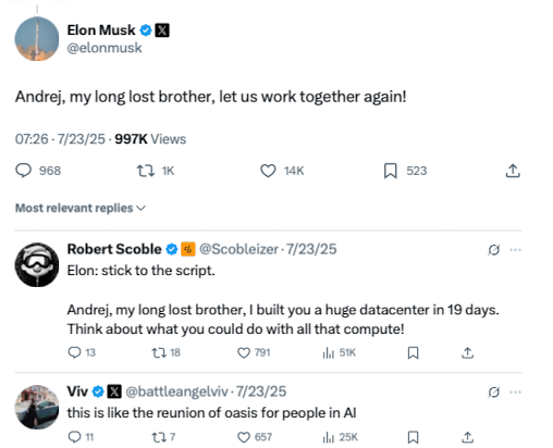 马斯克对顶级人才有多谦逊?为了请特斯拉前Autopilot业务负责人卡巴奇(Andej Karpathy)回来,马斯克甚至公开称卡巴奇是“自己失散多年的兄弟”,恳请他回来和自己一道共事。
