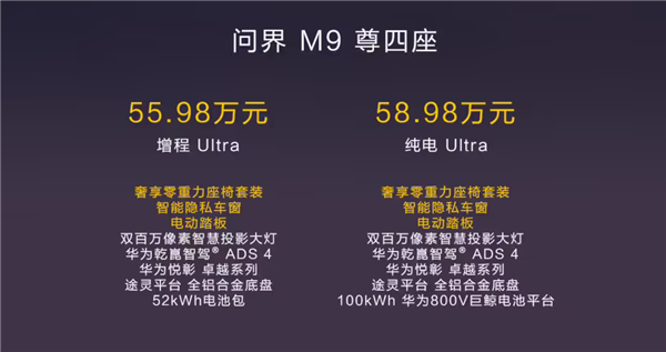价格方面,问界M9四座版可4万元选配零重力座椅套装、智能隐私车窗、电动踏板(原5万元)。
