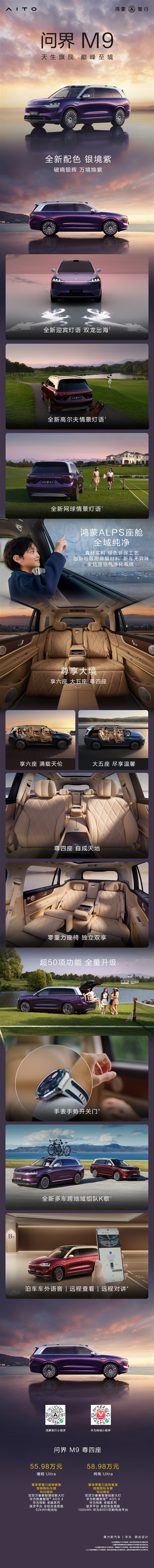 9月23日消息,今日晚间,华为举办鸿蒙智行秋季新品发布会,正式发布问界M9银镜紫新车,并新增尊四座配置套装。四座版提供增程Ultra和纯电Ultra两个版本,售价分别为55.98万元、58.98万元。