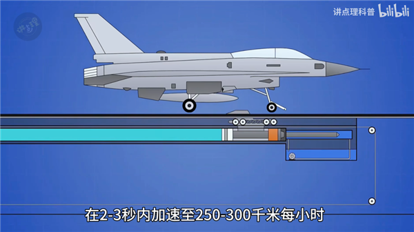 等飞机要起飞时,挤成一团的高压蒸汽,会瞬间释放到一条长长的管子里,爆炸一般的推力就会推动里面的活塞,活塞会拽着飞机,在两三秒内干到二百多公里的时速。