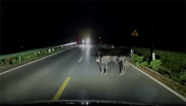 这头牛通体几乎为黑色,与夜色融为一体,远远看去确实不容易发现,而且它的胆子非常大,即便视频车刹停在了跟前,依旧不为所动。
