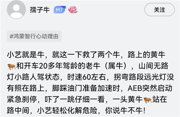 M7车主直言称,“小艺小艺就是牛,就这一下救了两个牛,路上的黄牛和开车20多年驾龄的老牛(属牛)。”