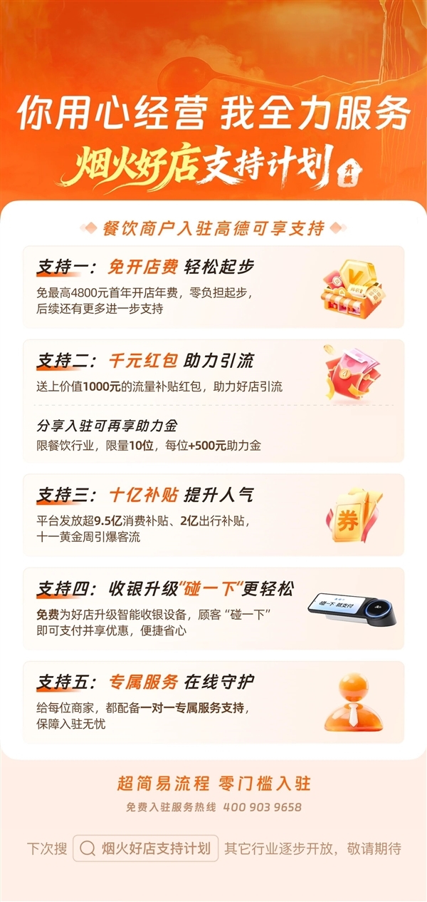此次政策的核心是“全免+多补”的组合拳。所有餐饮商家入驻高德免一年入驻年费。