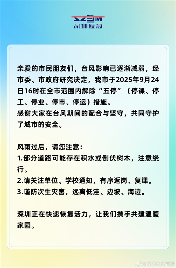 另外,深圳市防汛防旱防风指挥部通告,决定于24日16时起在全市范围内解除“五停”(停工、停业、停市、停运、停课)措施。