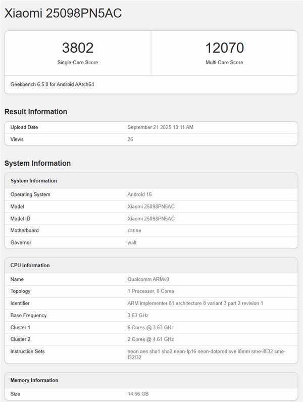 在CPU方面:第三代Qualcomm Oryon 架构,2颗4.6GHz超级核 + 6颗 3.62GHz 性能核,24MB共享缓存(双12MB分区)。