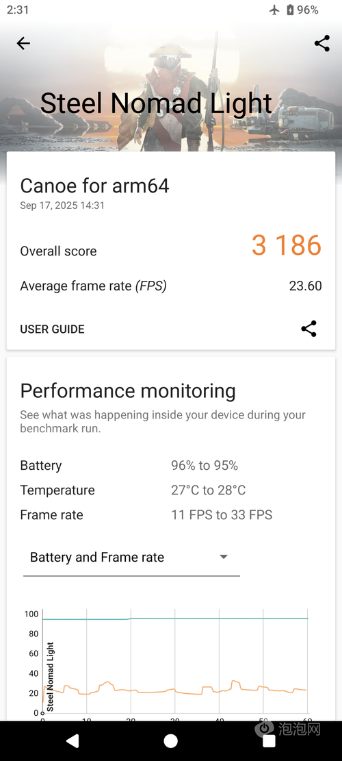 在GPU方面我们还使用了3DMark进行测试,选择项目为Steel Nomad Light,最终的总成绩为3186分,