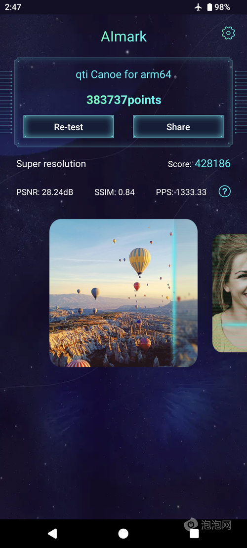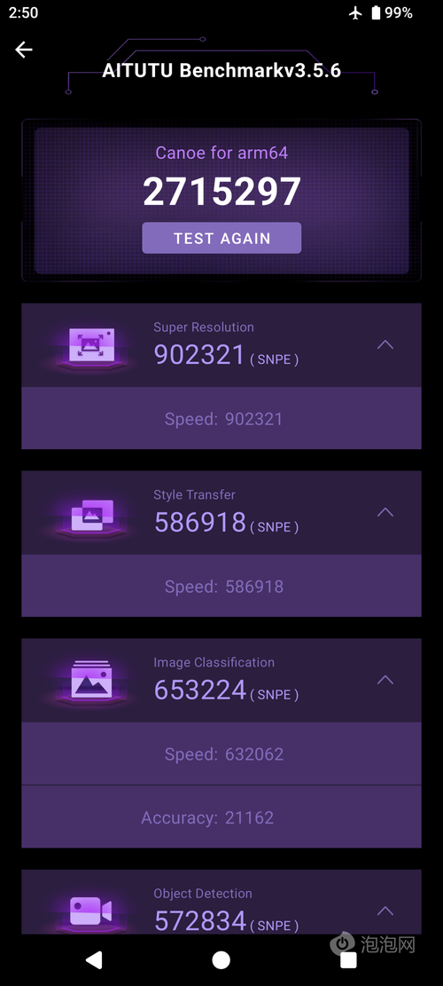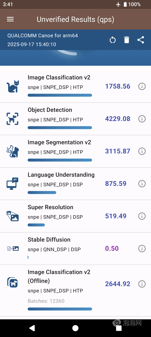AIMarkAI评测使用五种神经网络RDN、RESNET50、DEEPLABV3、FACENET、BERT模型,机器识别图片内容,输出可能的结果列表。最终,通过识别效率和准确度来判断手机AI性能,第五代骁龙8至尊版的成绩为383737。