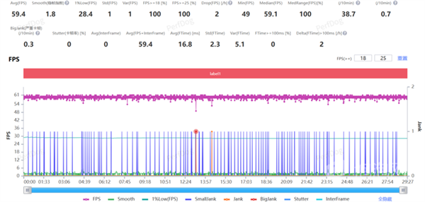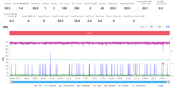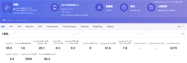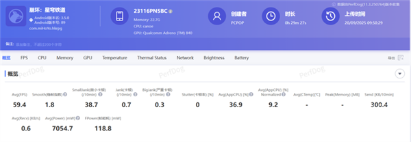 PerfDog测试显示,游戏平均帧率为59.5FPS,平均功耗为3.96W。