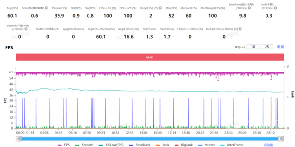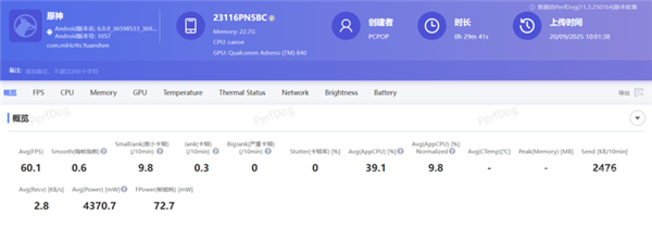 PerfDog测试显示,游戏平均帧率为60.1FPS,平均功耗为4.37W。