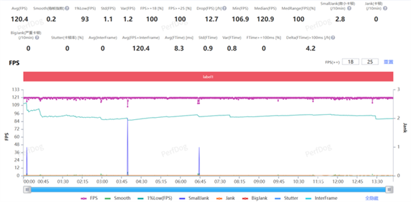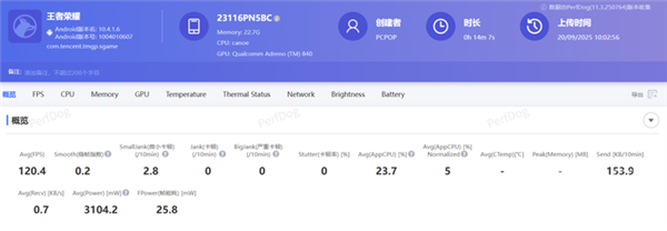 PerfDog测试显示,游戏平均帧率为120.4FPS,平均功耗为3.1W。