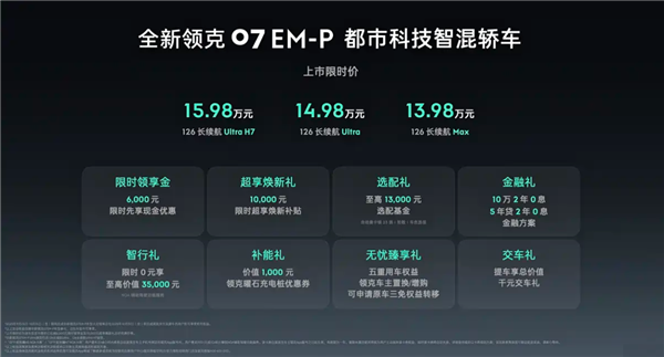 9月25日消息,今日晚间,新款领克07 EM-P上市,共推出3款车型,官方指导售价区间为15.58-17.58万元,上市限时价区间为13.98-15.98万元。