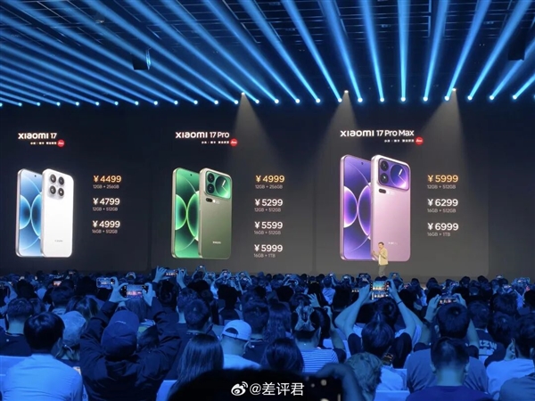 小米17 4499 元起,小米17 Pro 4999 元起,小米17 Pro Max 5999 元起。