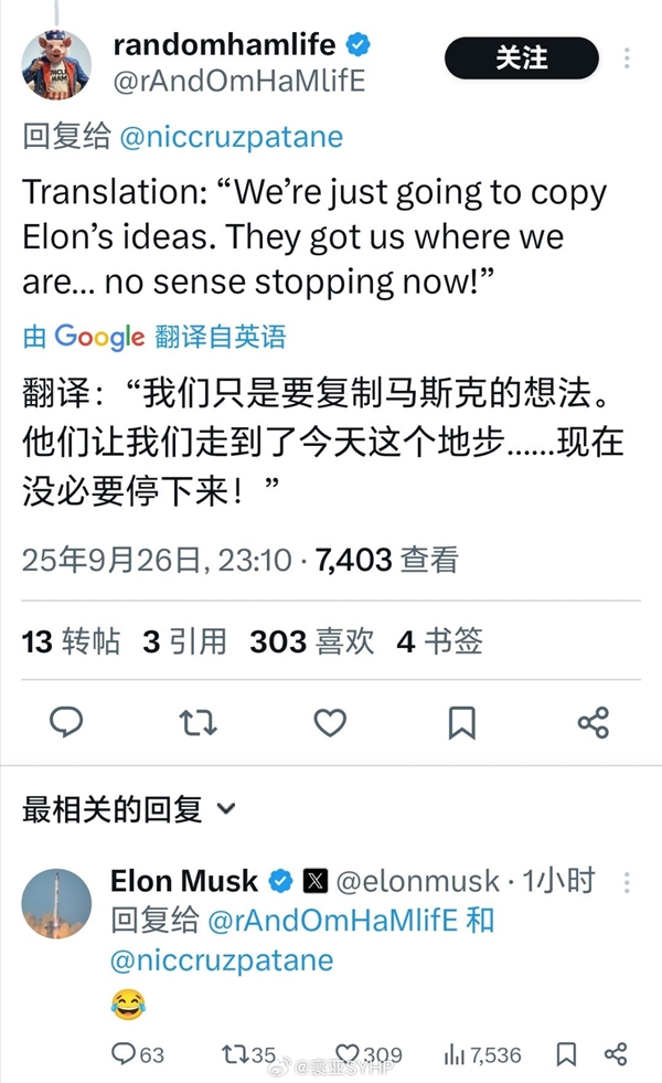有网友针对上面这段描述进行了总结:“我们只是要复制马斯克的想法,他们让我们走到了今天这个地步......现在没必要停下来!”
