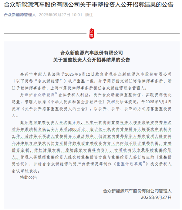 9月27日消息,今日,合众新能源汽车管理人发布《合众新能源汽车股份有限公司关于重整投资人公开招募结果的公告》。