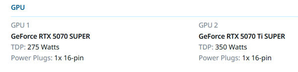 除了显存容量的提升,RTX 50 Super系列的功耗也有所增加,根据海韵电源计算器的信息,RTX 5070 Super的TDP为275W(标准版RTX 5070为250W),而RTX 5070 Ti Super的TDP则高达350W(标准版RTX 5070 Ti为300W)。