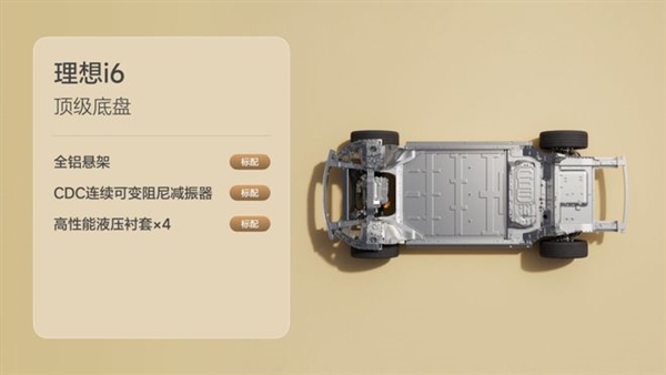 在底盘硬件上,理想i6配备前双叉臂和后五连杆独立悬架,并采用全铝摆臂,降低簧下质量。四驱版本配备前后双电机和智能四驱系统,零百加速能到达4.5秒。