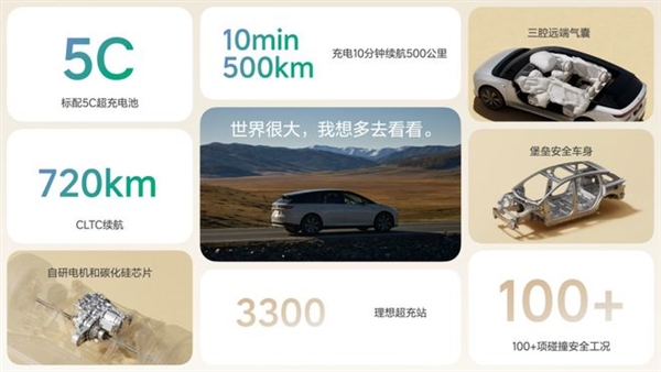 用理想的话来讲,标配就是顶配,超过60000元的配置全部标配。比如87.3kWh续航720km的5C 超充电池、全铝悬架、CDC连续可变阻尼的减振器,NVIDIA Thor-U芯片以及VLA司机大模型的AD MAX等。