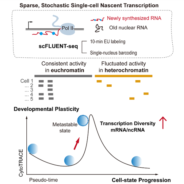 相关研究成果以“单细胞新生转录揭示稀疏的基因组使用与可塑性”为题,于9月26日在线发表于国际顶刊《细胞》(Cell)。