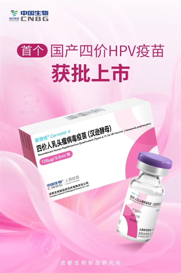 9月29日消息,近日,由国药集团中国生物所属成都生物制品研究所和中国生物研究院(新型疫苗国家工程研究中心)联合自主研发的国内首个四价人乳头瘤病毒疫苗(汉逊酵母)(爱薇佳)正式获国家药品监督管理局批准上市。