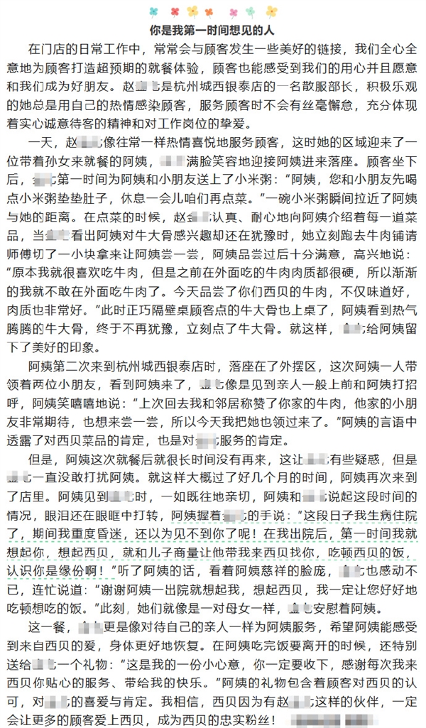 西贝官方账号“品味西贝”曾发布题为《你是我第一时间想见的人》的文章(实际发布于2020年,2025年9月被重新翻出)。文中描述一位杭州顾客阿姨在经历“重度昏迷”出院后,第一时间要求儿子带她去西贝餐厅吃饭,并紧握服务员的手流泪倾诉:“还以为见不到你了!”。