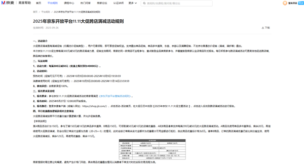 跨店满减方面,活动力度为每满300元减50元(优惠上限封顶为40000元),促销费用同样由商家全部承担。