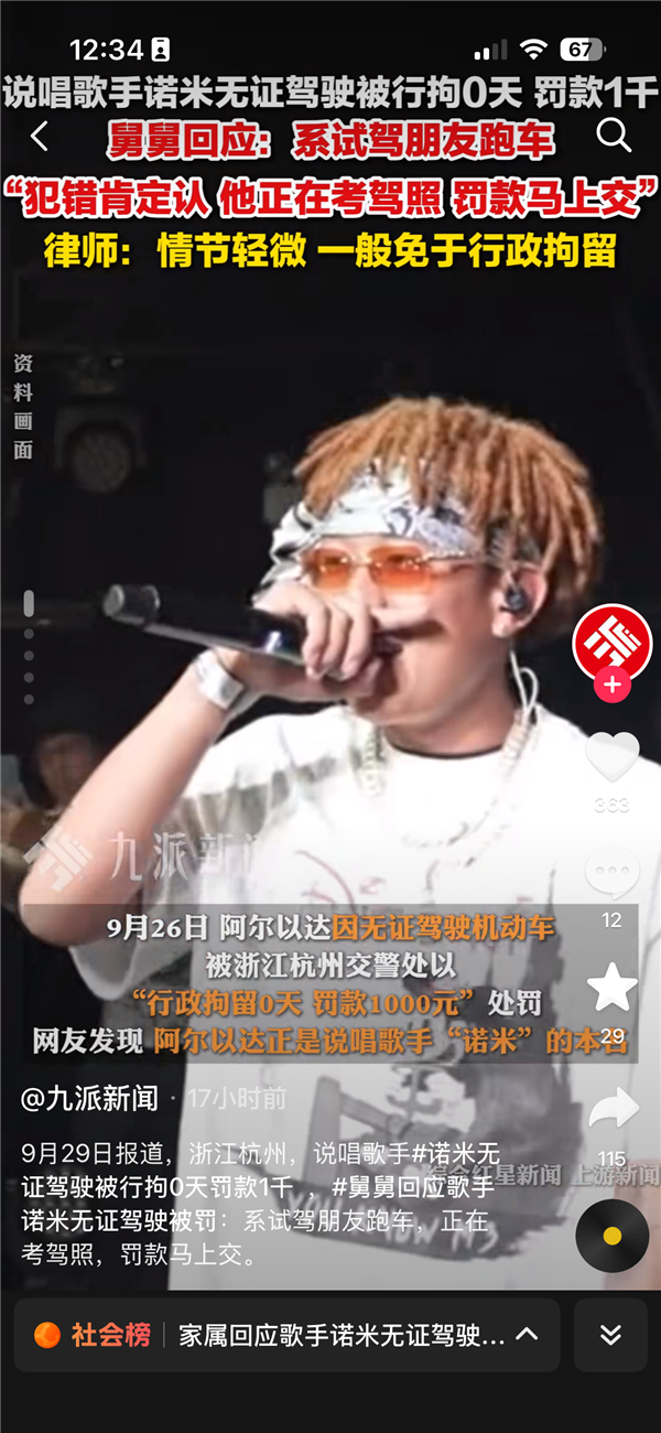 9月30日消息,今日,说唱歌手诺米在社交平台公开道歉,此前自己因无证驾驶被罚的事件。