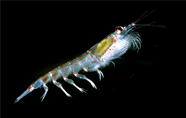 南极磷虾(Euphausia superba),广泛分布于南极海域(高度集中于在南大洋的大西洋地区,特别是在南极半岛、南奥克尼群岛和乔治亚岛区域的低水温海域),主要以浮游植物为食,是一种体长仅 3~6 厘米的微小甲壳动物,最大体长也就 6.5 厘米,体重约为 2 克。[3]