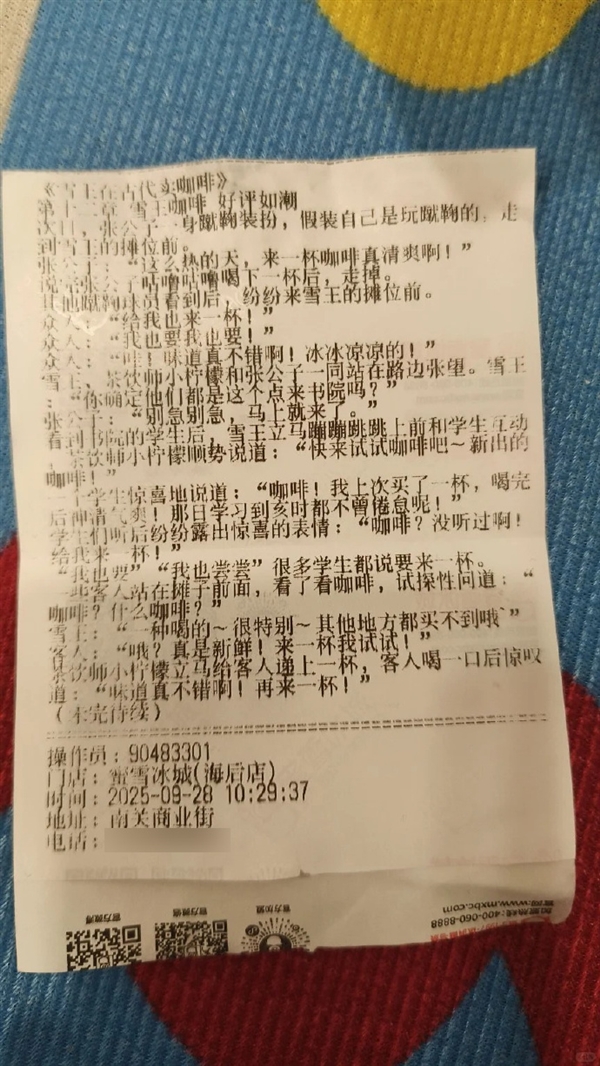 10月9日消息,近日,不少网友表示,在购买蜜雪冰城后,发现店家的小票上印有小说。