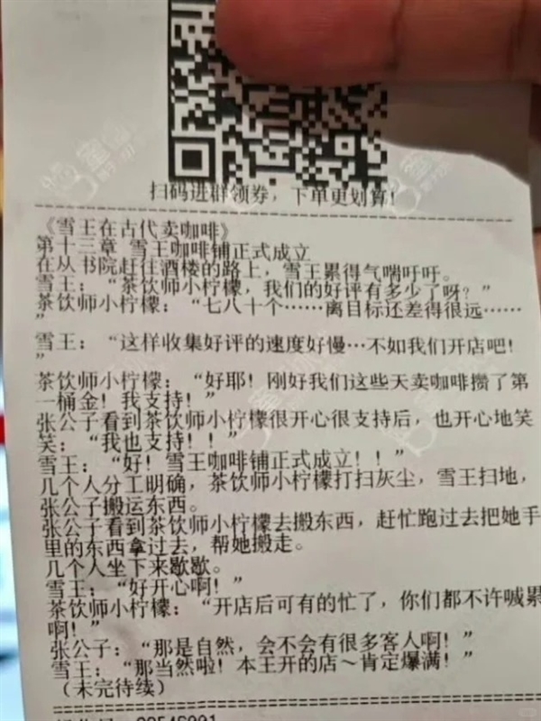 据悉,该连载小说名为《雪王在古代卖咖啡》,共20章,自9月起章节随机印在蜜雪冰城全国门店的小票上,顾客凭购物小票即可收集。