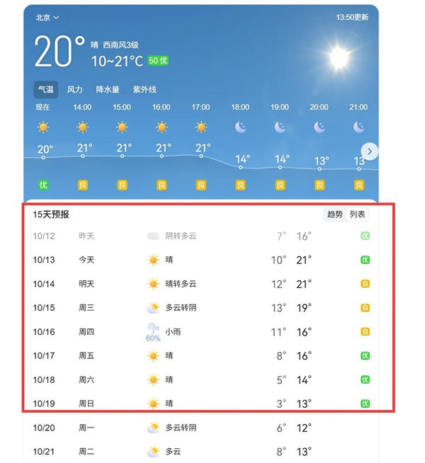 以北京为例,北京市气象台预计今天早晨至白天晴间多云,北转南风2至3级,最高气温21℃;夜间晴间多云,有轻雾或雾,南转北风1至2级,最低气温10℃。