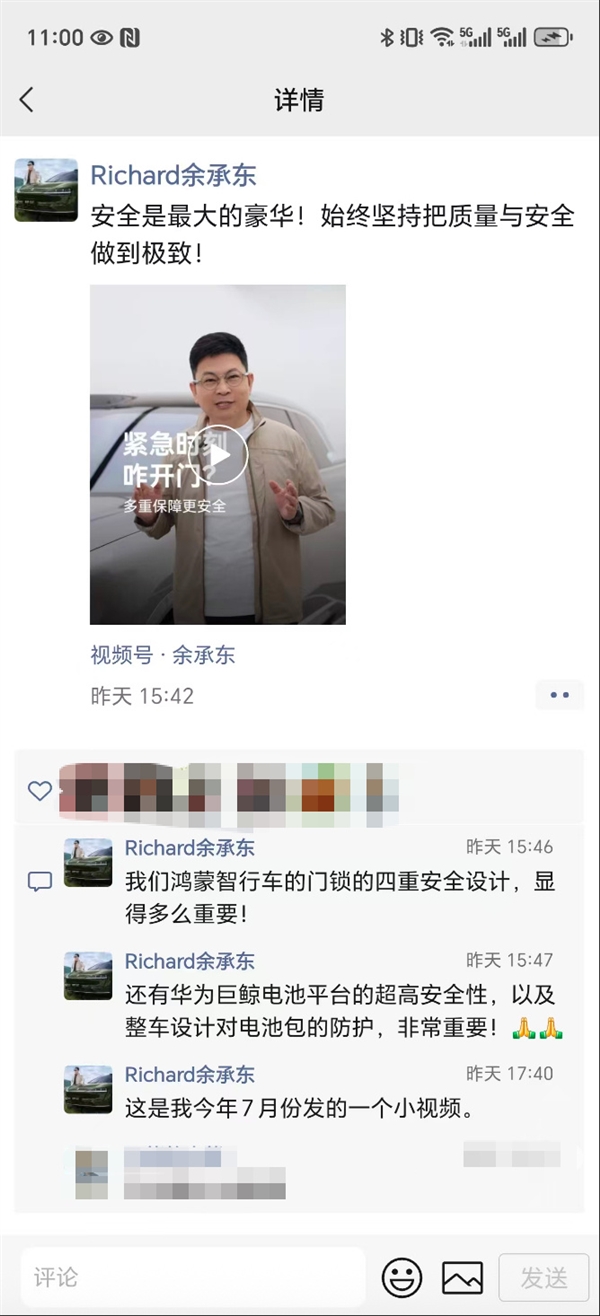 值得一提的是,在评论区,他留言表示:我们鸿蒙智行车的门锁的四重安全设计,显得多么重要!