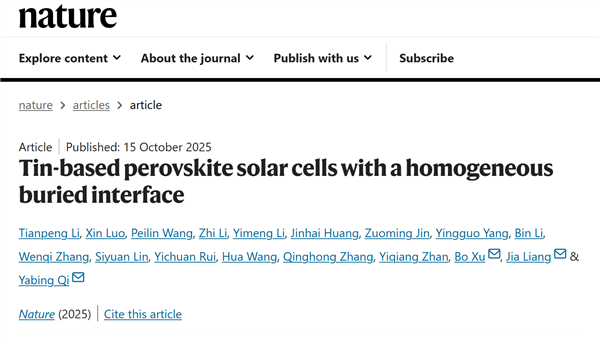 相关成果以《基于均一埋底界面的锡基钙钛矿太阳能电池》(Tin-based perovskite solar cells with a homogeneous buried interface)为题,在《自然》(Nature)期刊发表。