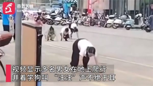 相关视频画面显示,有多名男女在地上做出爬行动作往前走,“汪汪”声不绝于耳。
