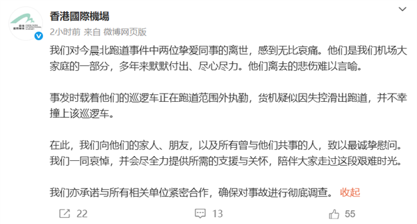 香港国际机场今日下午发布相关通报称,我们对今晨北跑道事件中两位挚爱同事的离世,感到无比哀痛。